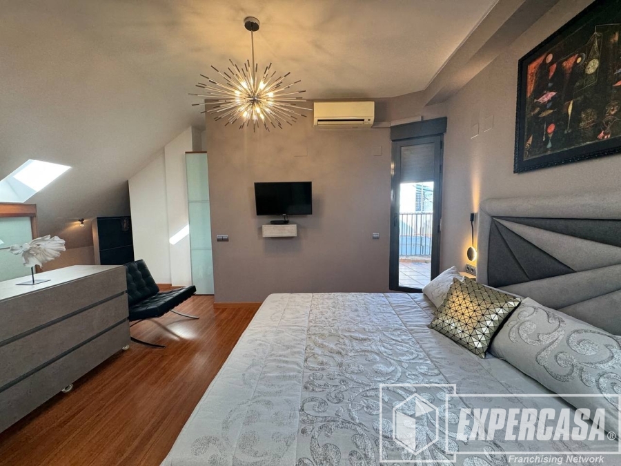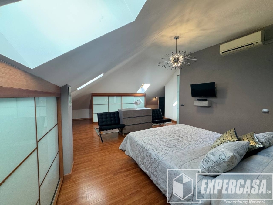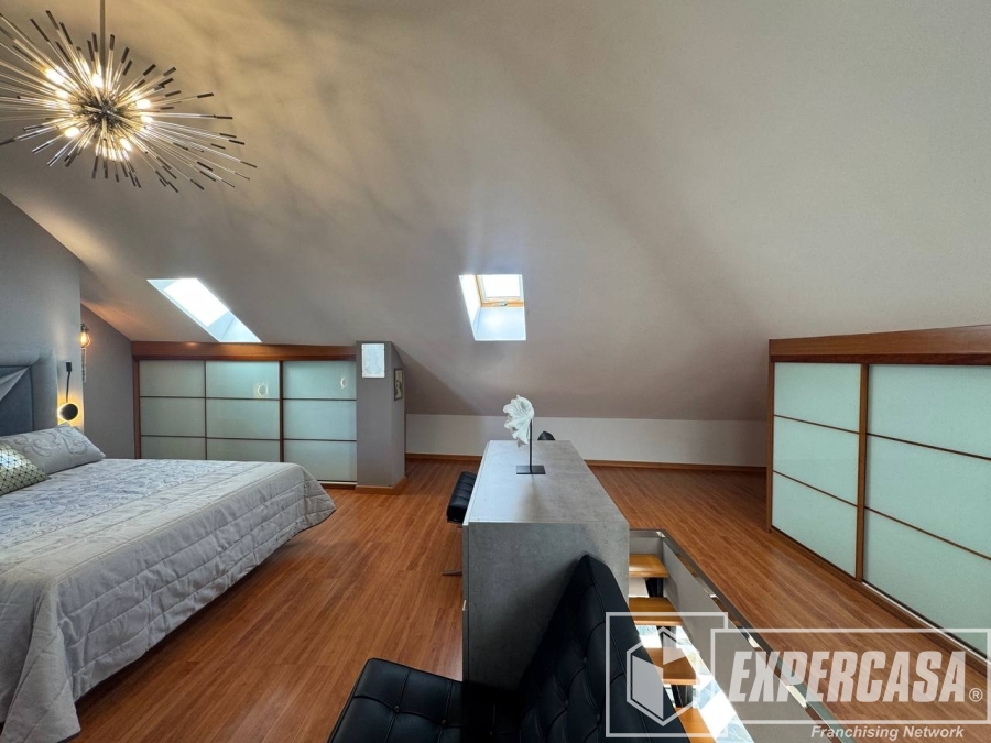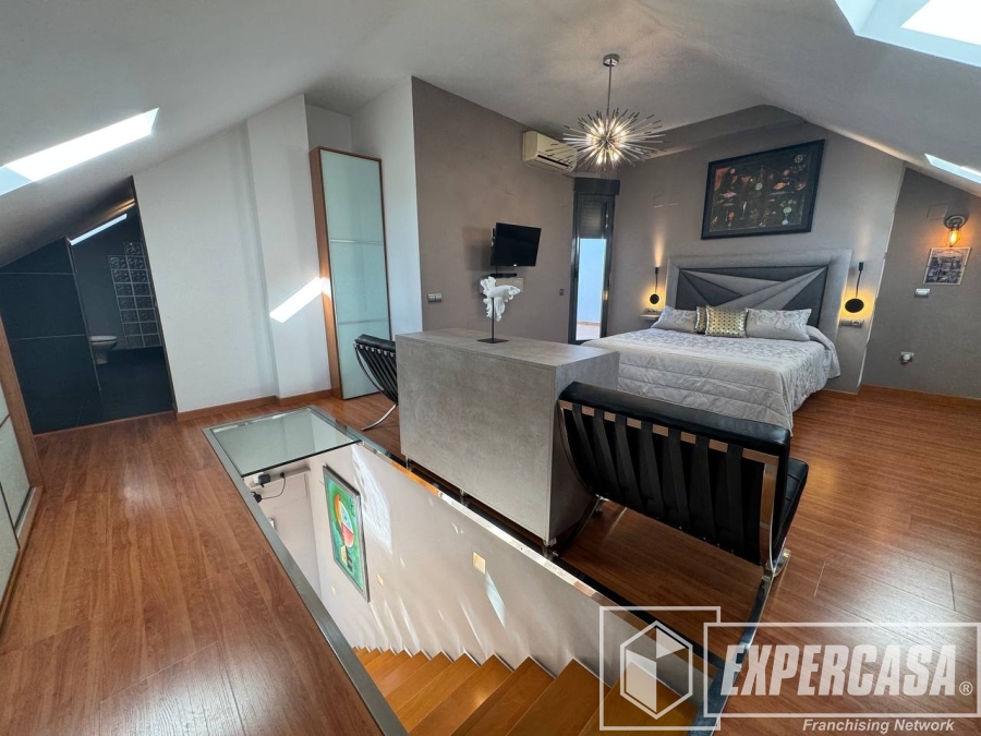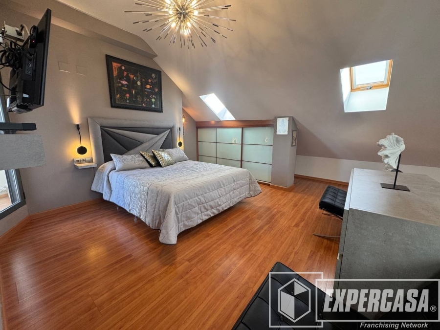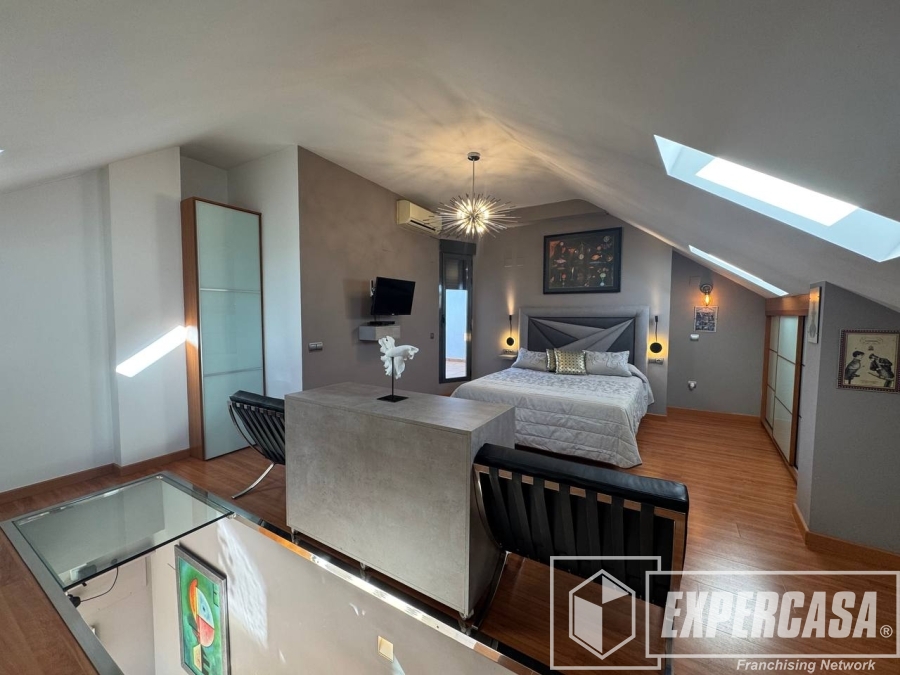 La habitación principal de 40 m², ubicada en la planta alta, cuenta con baño completo en suite y acceso directo a la terraza interior; dispone de ventanas tipo lucernario que aportan luz natural.