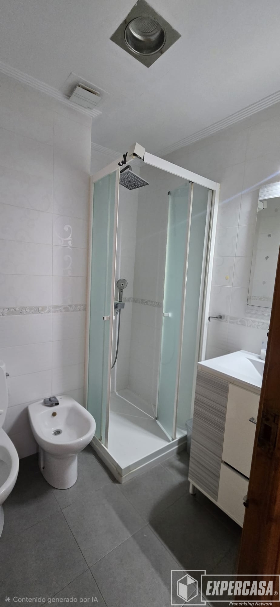 *Baño: Cuarto de baño equipado con un amplio plato ducha con mampara, bidé y un mueble de lavabo contemporáneo.