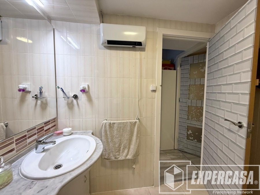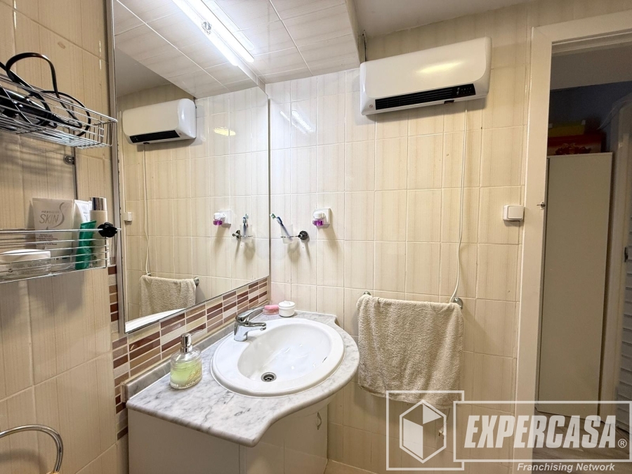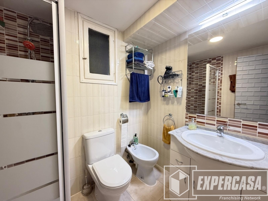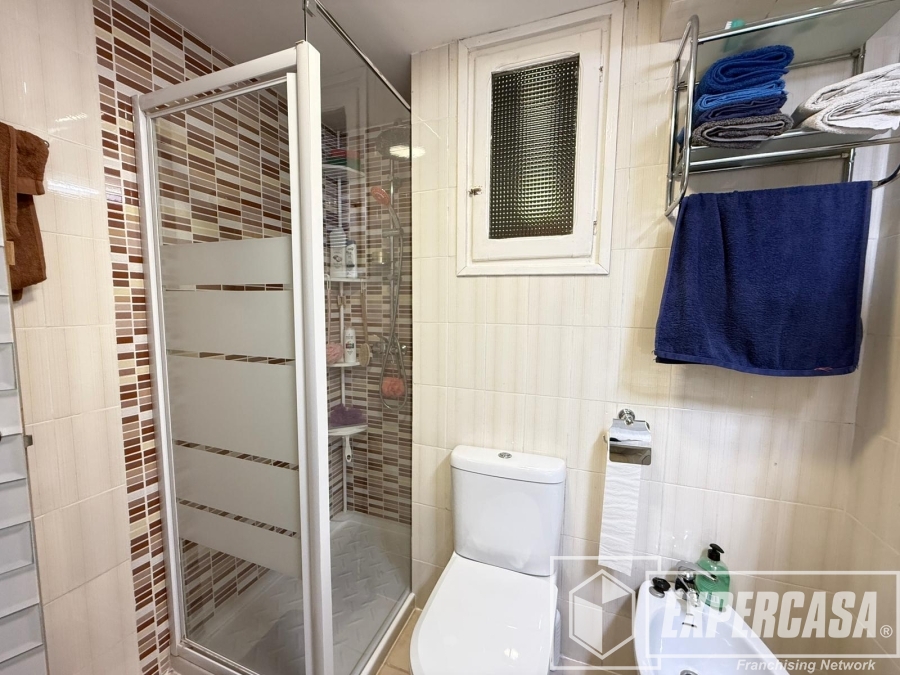El baño completo está equipado con plato de ducha y mampara, lavabo con mueble de almacenamiento y ventilación natural mediante ventana.