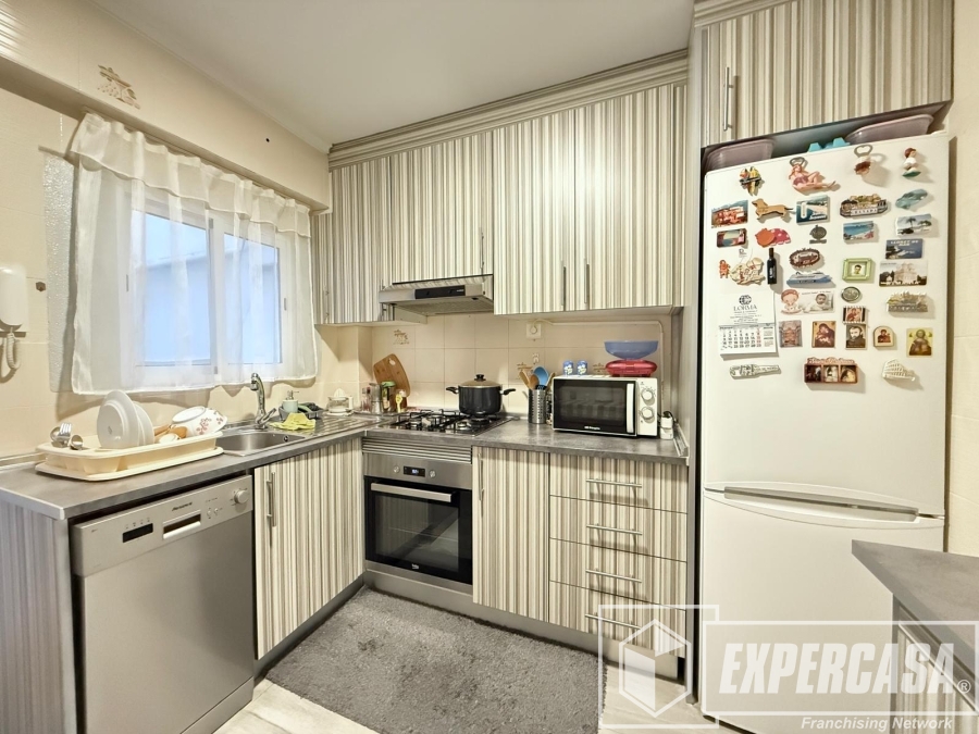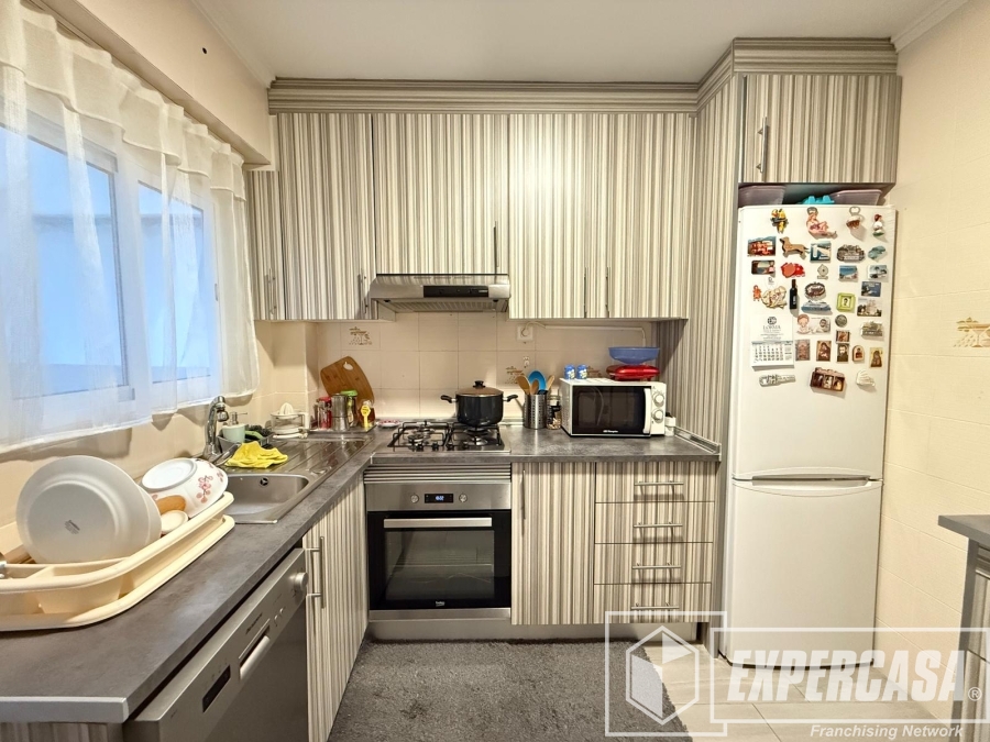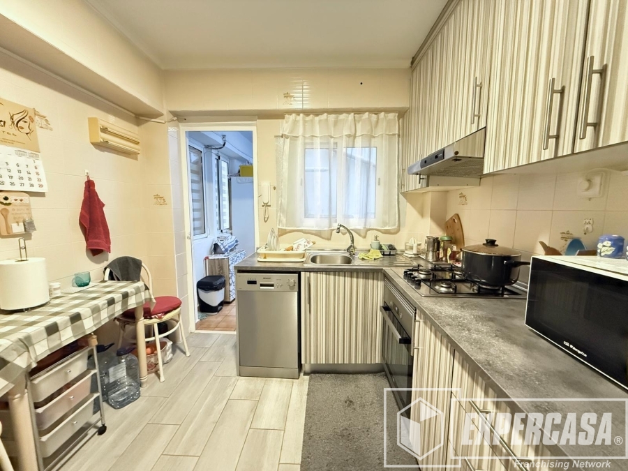 La cocina independiente es práctica y funcional, equipada con cocina de gas butano, horno eléctrico y lavavajillas, además de contar con gran capacidad de almacenamiento gracias a sus muebles altos y bajos. Desde la cocina se accede a una galería exterior, donde se encuentra la zona de lavado.